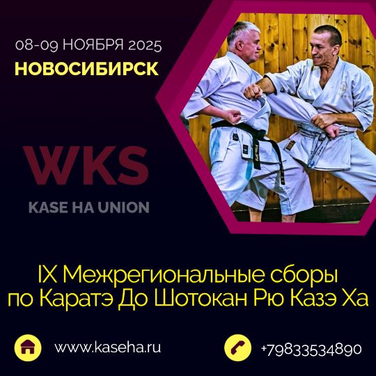 08-09 ноября 2025 года в городе Новосибирск пройдут IX Межрегиональные сборы по Каратэ До Шотокан Рю Казэ Ха под руководством И.Р. Садовникова 8 Дан. Организатор: Филиал Новосибирской области, руководитель В.А. Донченко 5 ДанWKS KASE HA UNION. Заявки по телефону:+7 983 353 4890